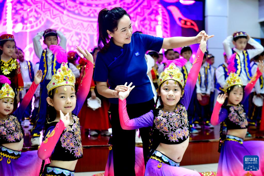 6月21日,在日照市新营小学交流挂职的老师玛依热·努尔买买提指导学生排练舞蹈《新娃哈哈》。