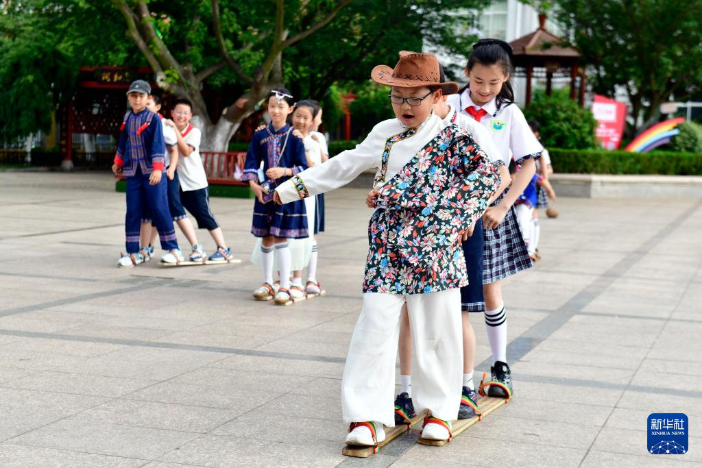 6月21日,日照市新营小学的同学们在练习壮族民间传统体育项目板鞋竞速。