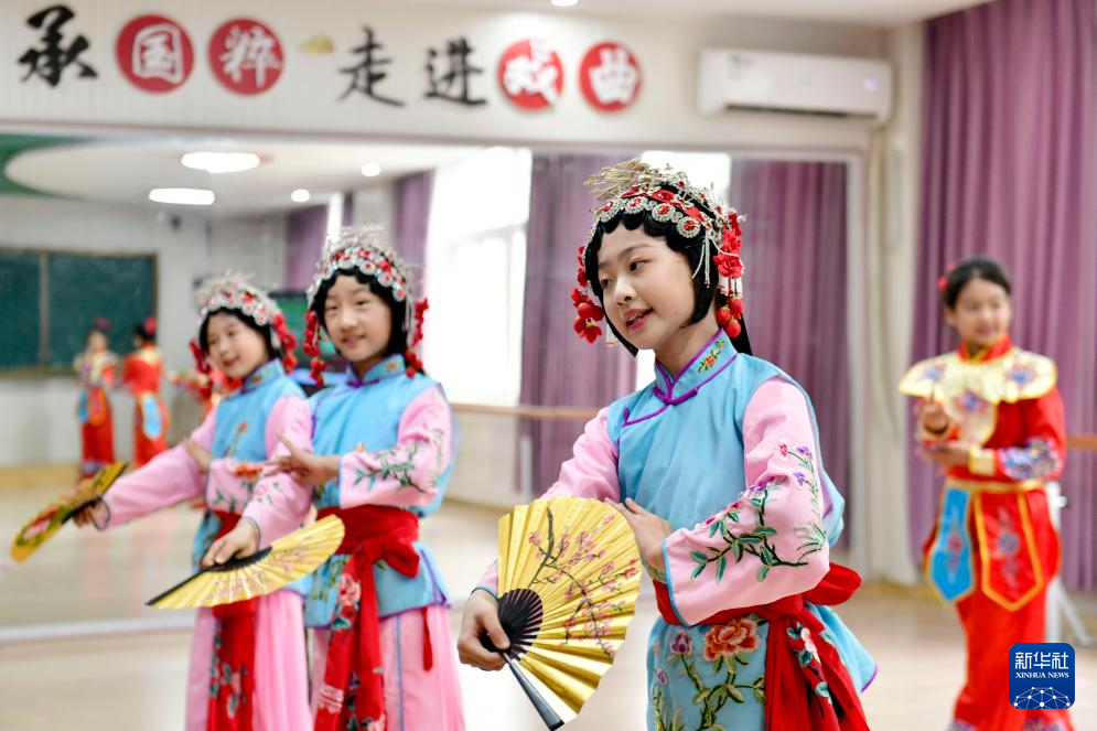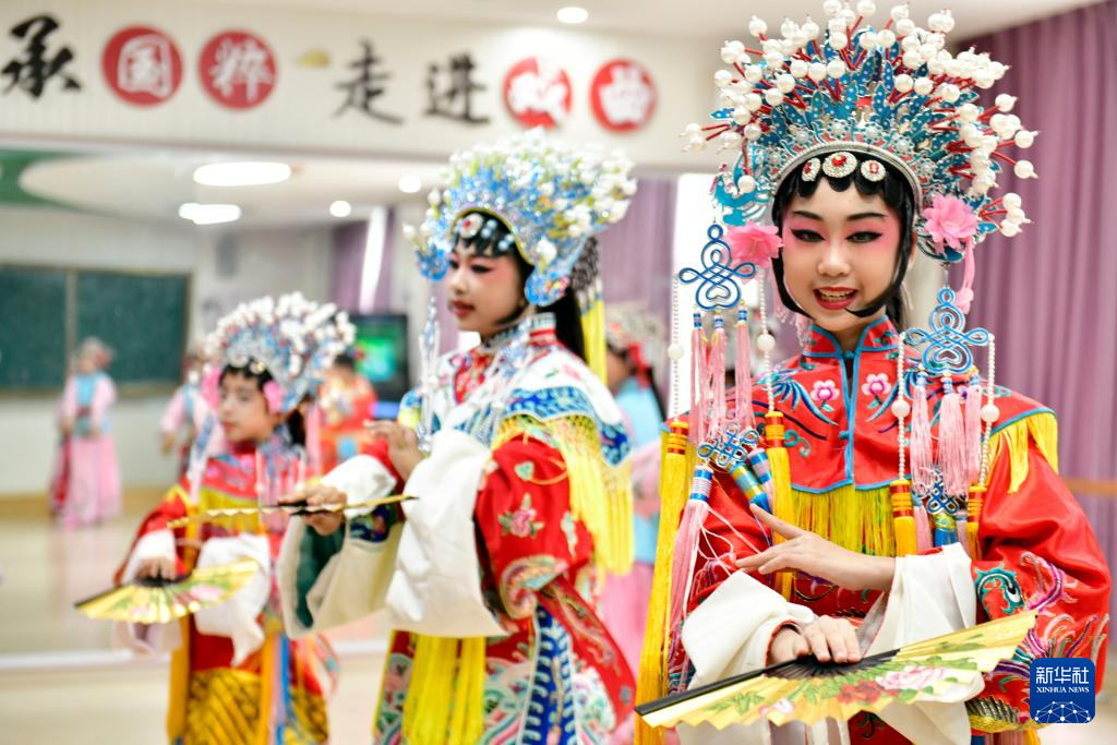 6月21日,日照市新营小学民族特色曲艺小组的同学们在排练戏曲《京韵华彩》。