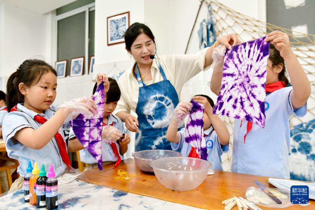 6月21日,日照市金海岸小学的同学们在老师的带领下学习扎染。
