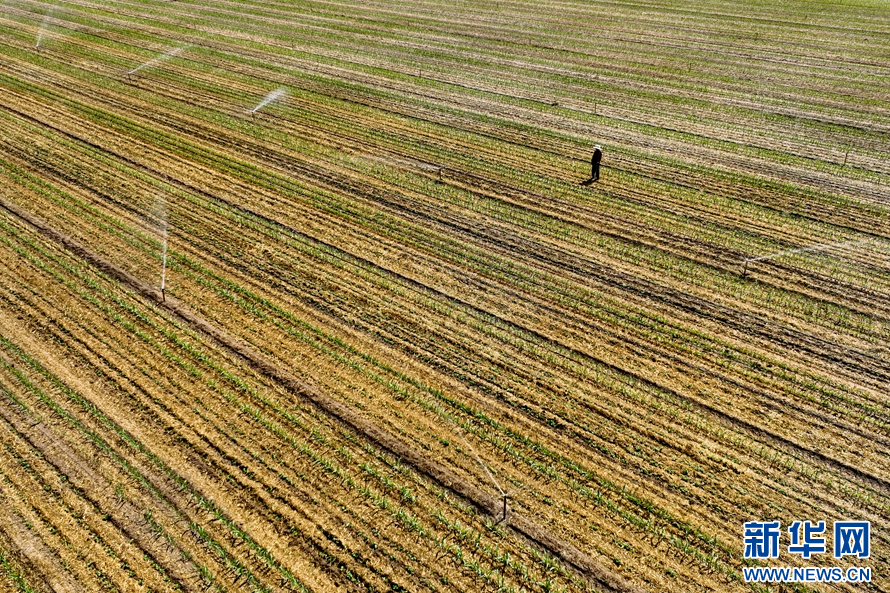 近日,在山东省聊城市茌平区冯官屯镇菜刘村大豆玉米带状复合种植田里,农民正使用滴灌设备浇水补墒。新华网发(马红坤 摄)