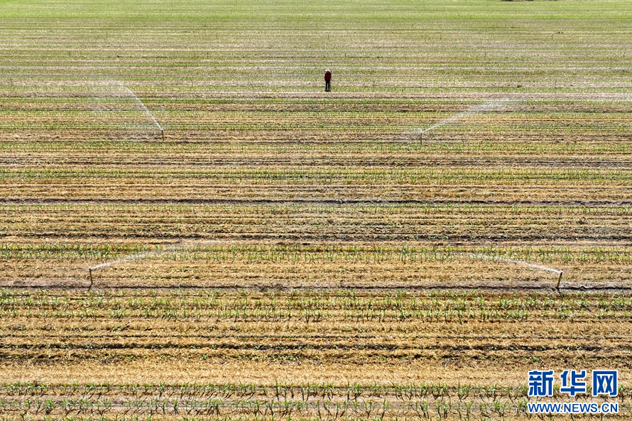 近日,在山东省聊城市茌平区冯官屯镇武赵村大豆玉米带状复合种植田里,农民正使用智能伸缩式喷灌设备浇水补墒(无人机照片)。新华网发(马红坤 摄)