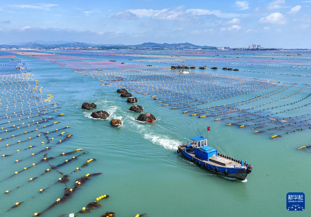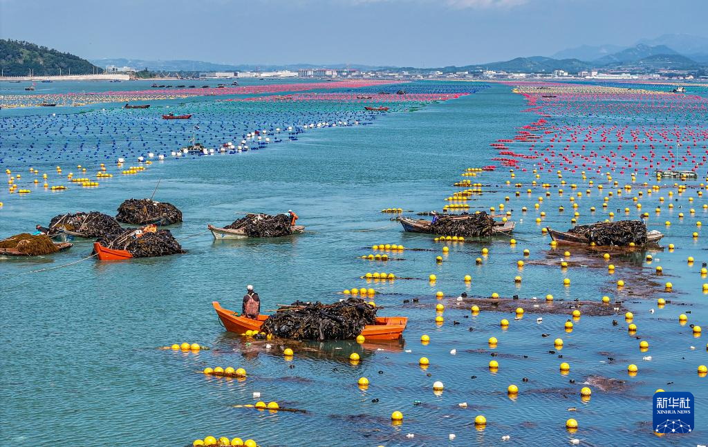 眼下,山东省荣成市15万亩海带采收作业接近尾声,收获进度达90%,预计年产量170万吨。新华社记者 朱峥 摄