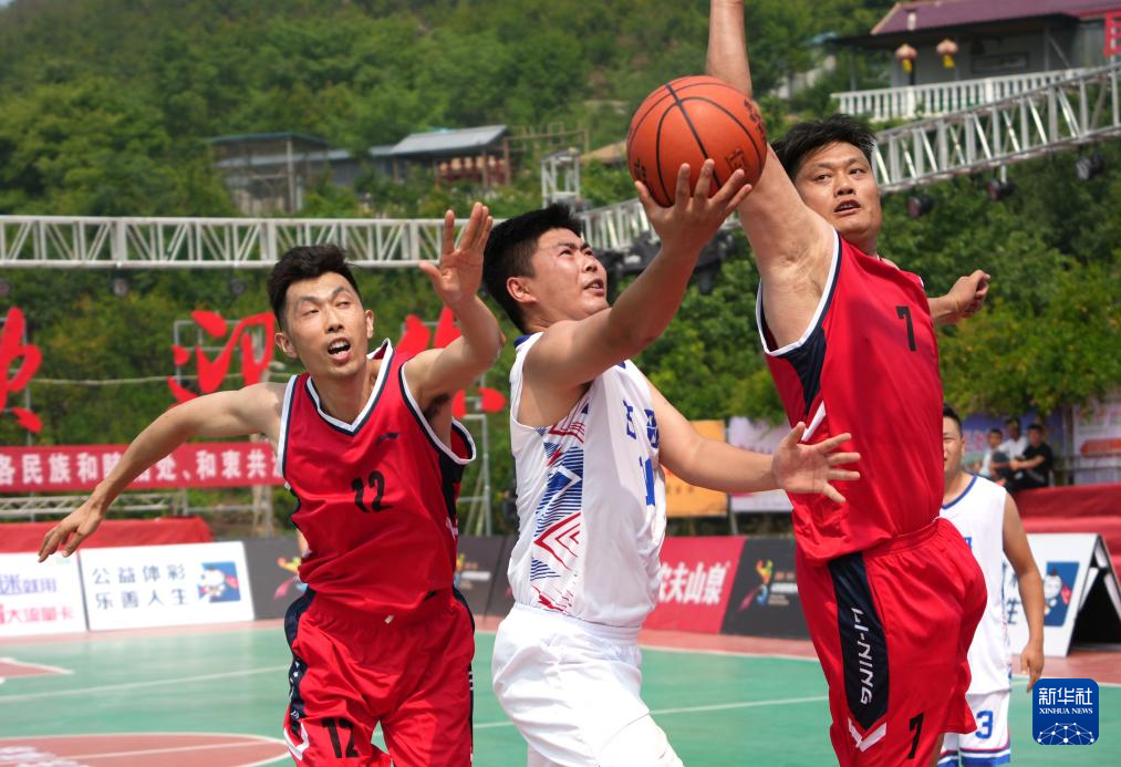 7月12日,枣庄市峄城区古邵镇代表队球员胡臣(中)在比赛中上篮。