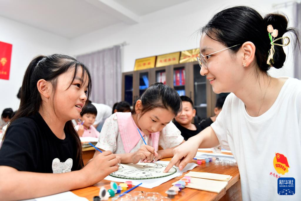 7月18日,在菏泽市牡丹区高庄镇燕王庄村“小荷学堂”,来自青岛理工大学的志愿者和孩子一起做团扇。新华社记者 郭绪雷 摄