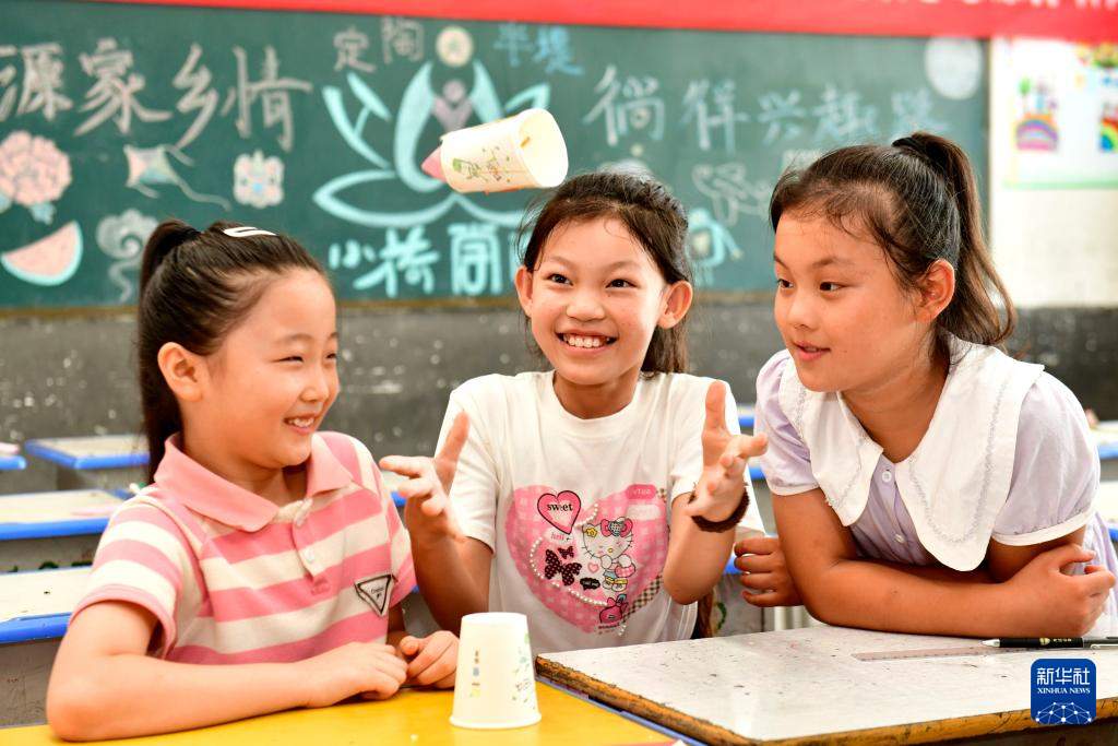 7月19日,在菏泽市定陶区半堤镇“小荷学堂”,孩子们在做纸杯火箭小实验。新华社记者 郭绪雷 摄