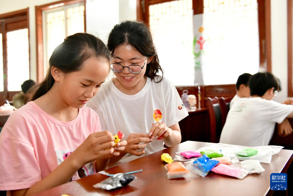 7月19日,在菏泽市定陶区仿山镇“小荷学堂”,来自青岛理工大学的志愿者和孩子们一起做泥塑。新华社记者 郭绪雷 摄