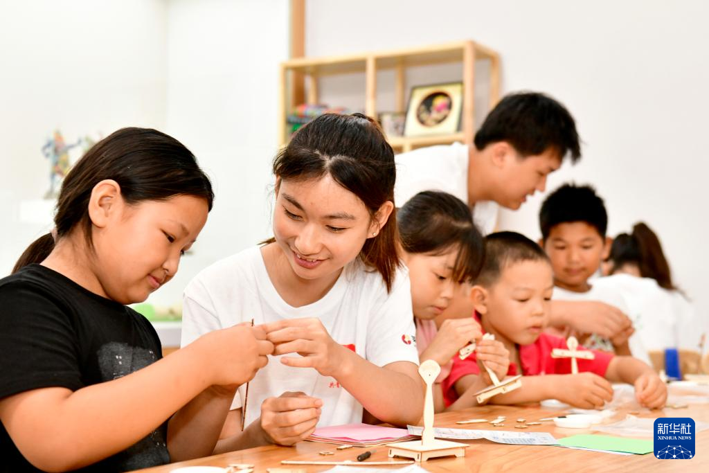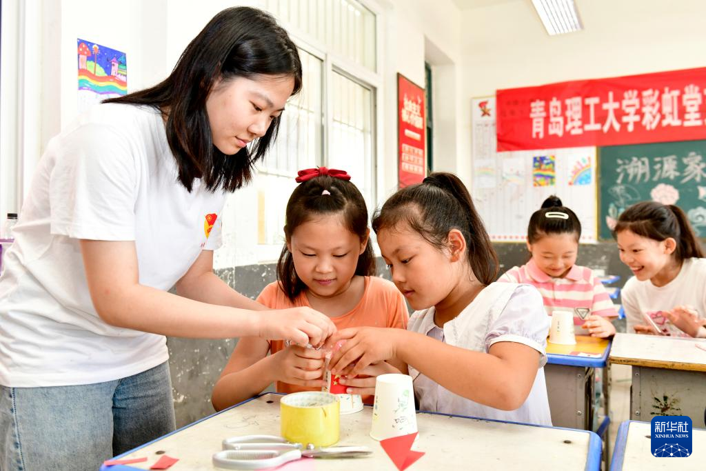 7月18日,在菏泽市牡丹区小留镇刘庄村“小荷学堂”,来自山东财经大学的志愿者和孩子一起做手工。新华社记者 郭绪雷 摄
