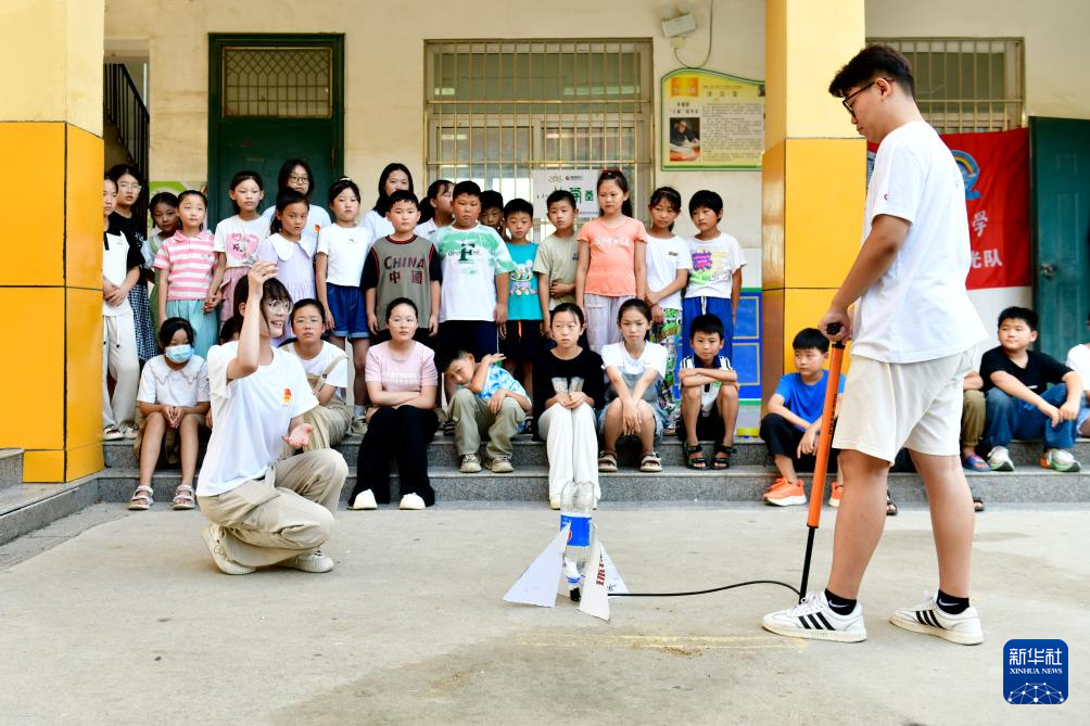 7月19日,在菏泽市定陶区半堤镇“小荷学堂”,来自青岛理工大学的志愿者为孩子们做气压式喷水火箭小实验。新华社记者 郭绪雷 摄