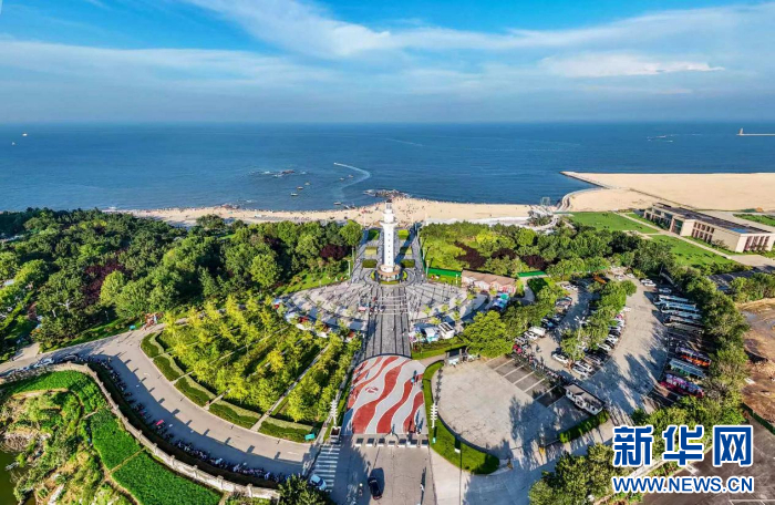 海滨公园的绿意与沙滩海景相映成趣。新华网发(郭宝安 摄)