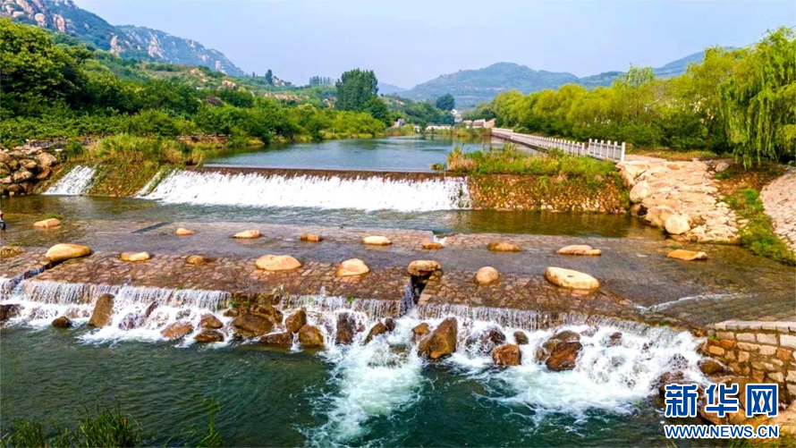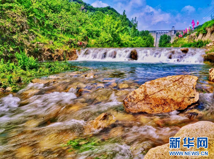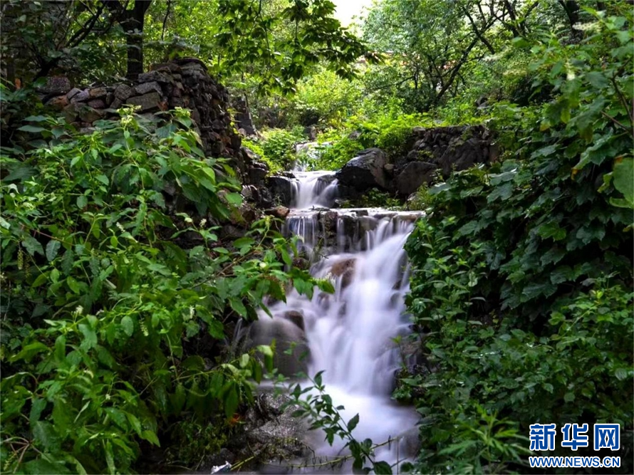 黄崖川村远山叠翠,涌动的河水带来阵阵清凉。新华网发(武爱民 摄)