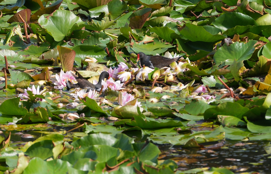 在山东省邹平市魏桥镇田李靳村满塘盛开的睡莲丛中,一对水鸟“情侣”在用荷叶和莲花搭建“爱巢”,上演了一段“恋曲”。雄鸟在荷塘里穿梭,把莲花、荷叶叼回巢,雌鸟“欣然”接受献花,啄花动作十分灵巧。