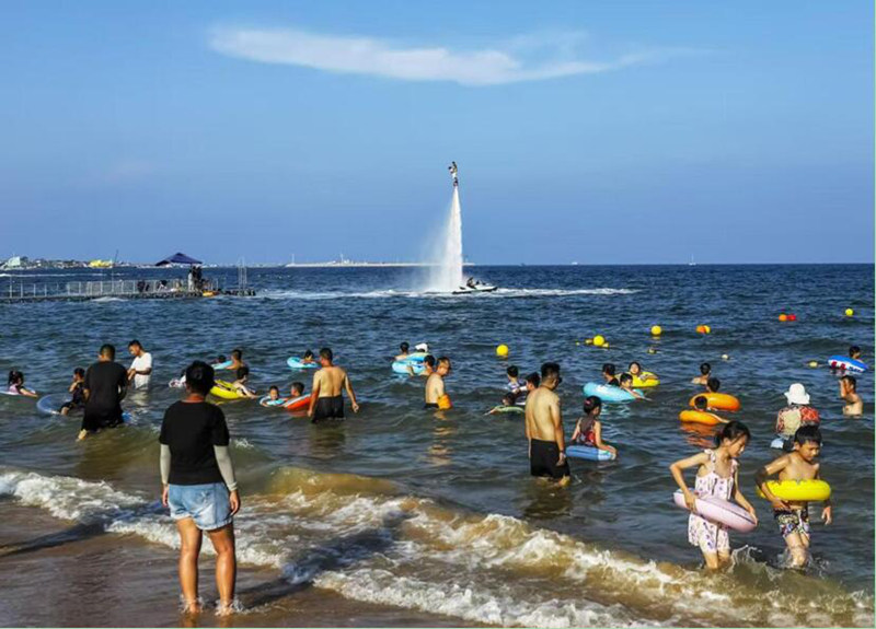 8月20日,万平口景区,小朋友们在大人的陪同下海中嬉戏,远处游客正在体验刺激的“海上飞人”游玩项目。郭宝安 摄