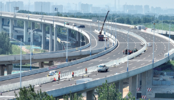8月22日,新建104京岚线济南黄河公路大桥主桥、滩地引桥、跨大堤桥已完成上面层沥青摊铺施工。在主桥北侧的引桥路段,路面交通标识线已经施划到位,路灯安装完成,施工人员正在进行防撞隔离栏的安装工作。在引桥与地面道路连接处,三座收费站的遮雨棚主体安装到位,施工进入遮雨棚装饰和收费站内部设施安装阶段。