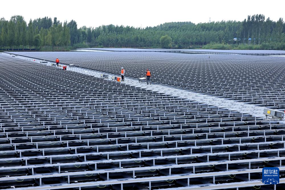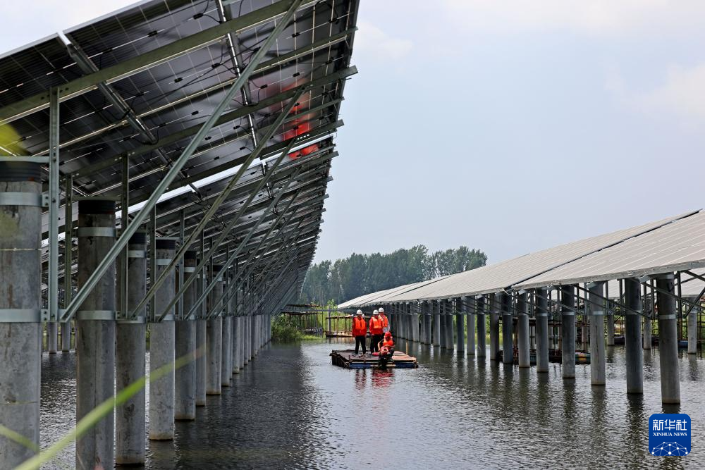 9月8日,在滕州市西岗镇治理后的煤矿塌陷地区域,工作人员对“渔光互补”光伏发电项目进行巡检。