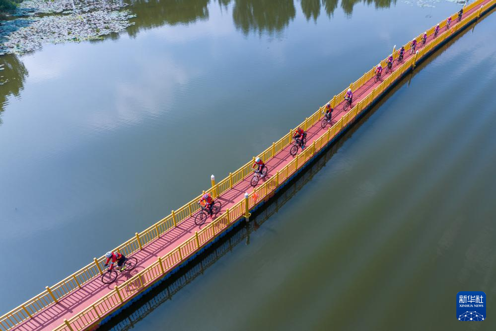 9月8日,骑行爱好者在滕州市九龙湾湿地公园健身骑行(无人机照片)。该湿地公园原属一处煤矿塌陷地区域。