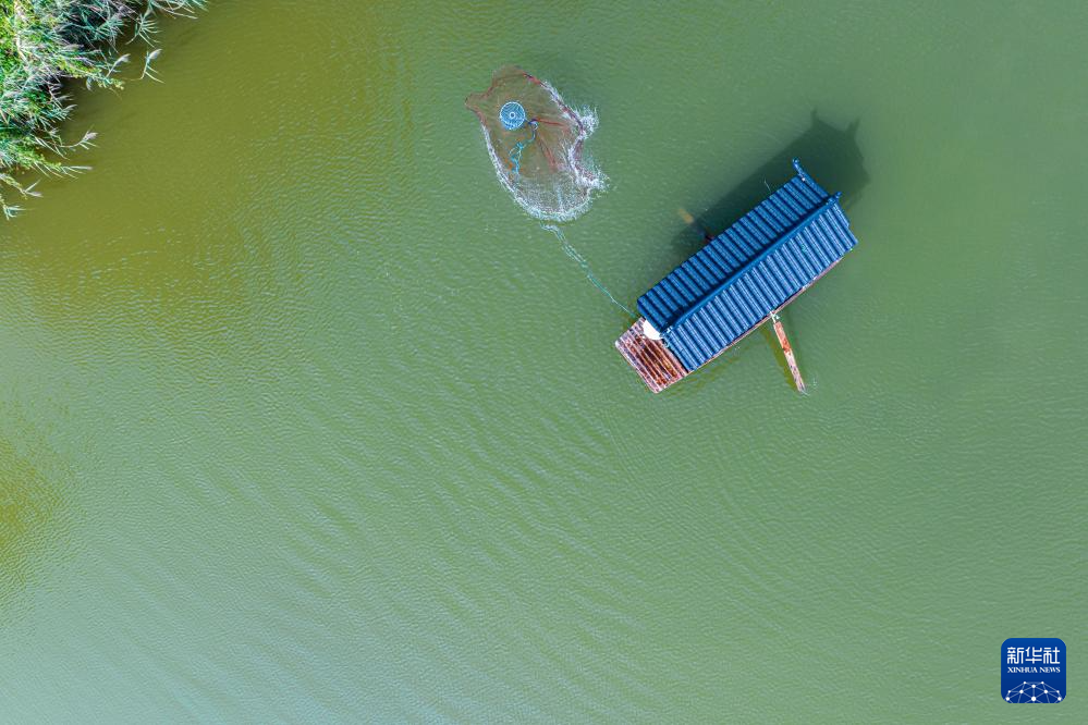 9月8日,在滕州市滨湖镇西迭湖村,村民在治理后的煤矿塌陷地区域撒网捕鱼(无人机照片)。