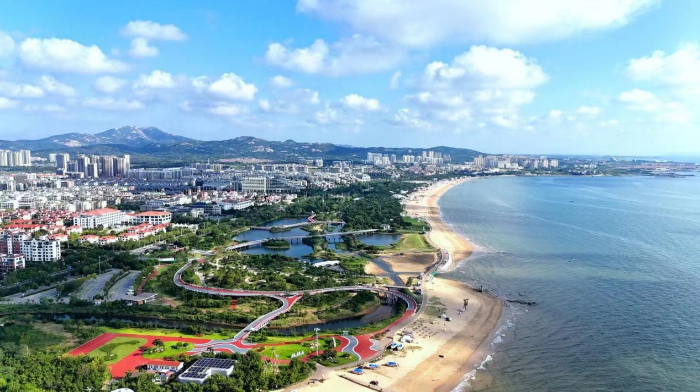 9月10日,航拍镜头下的阳光海岸绿道如一条丝带通向大海。孙建国 摄