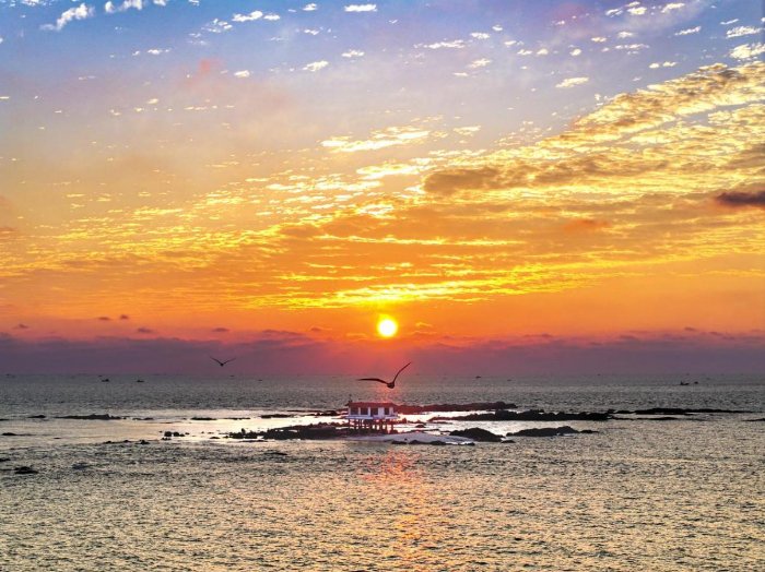 9月13日,在日照太公岛风景区,红日跃出海面将天空染成金黄,海鸥掠过海面自由翱翔。单英 摄