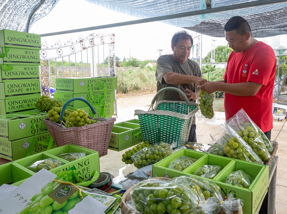 临近中秋,潘家泊村葡萄礼盒畅销,种植户们正抓紧分级筛选、分装刚采摘的葡萄。新华网发(刘卫芳 摄)