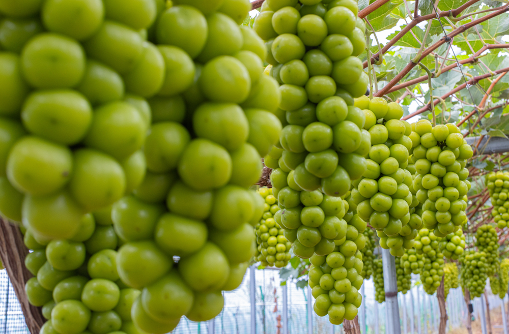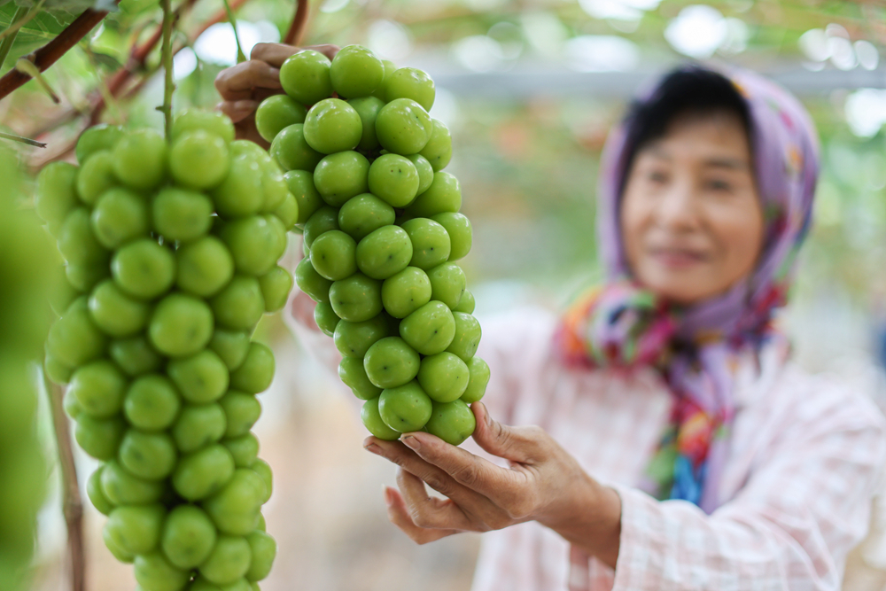 潘家泊村葡萄颗粒硕大、果型漂亮、饱满紧实、晶莹剔透。新华网发(于永本 摄)