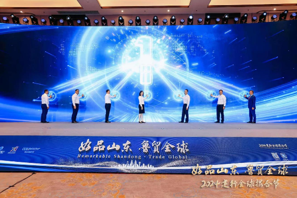 会议现场,山东省商务厅副厅长王红、烟台市人大常委会副主任陈洪军、中国建设银行国际业务部副总经理黄玮、中国建设银行山东省分行行长文志军、中国出口信用保险公司山东分公司总经理助理刘刚、烟台明远创意生活科技股份有限公司董事长陈义忠、山东高速齐鲁号欧亚班列运营有限公司副总经理汤国辉共同上台为“好品山东 鲁贸全球”2024建行全球撮合节活动启动。