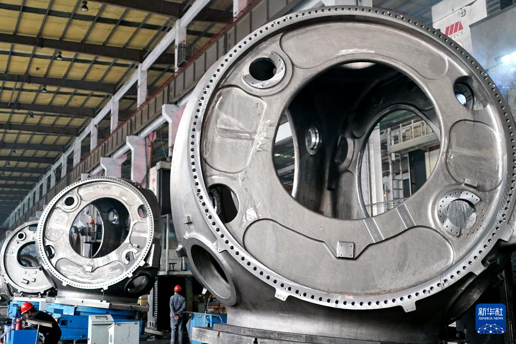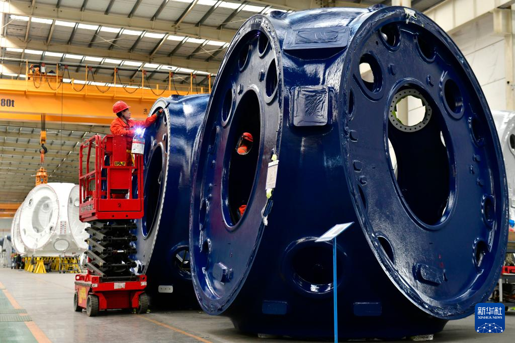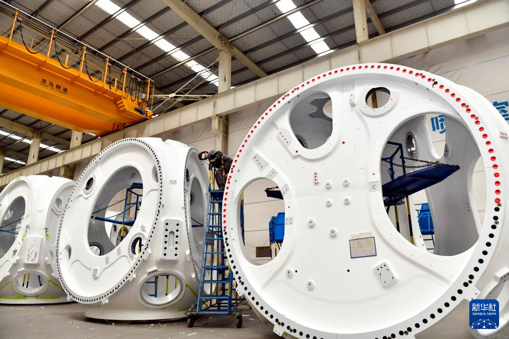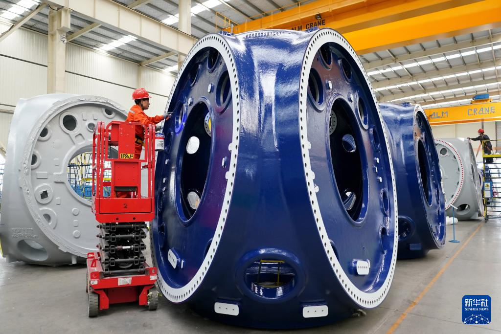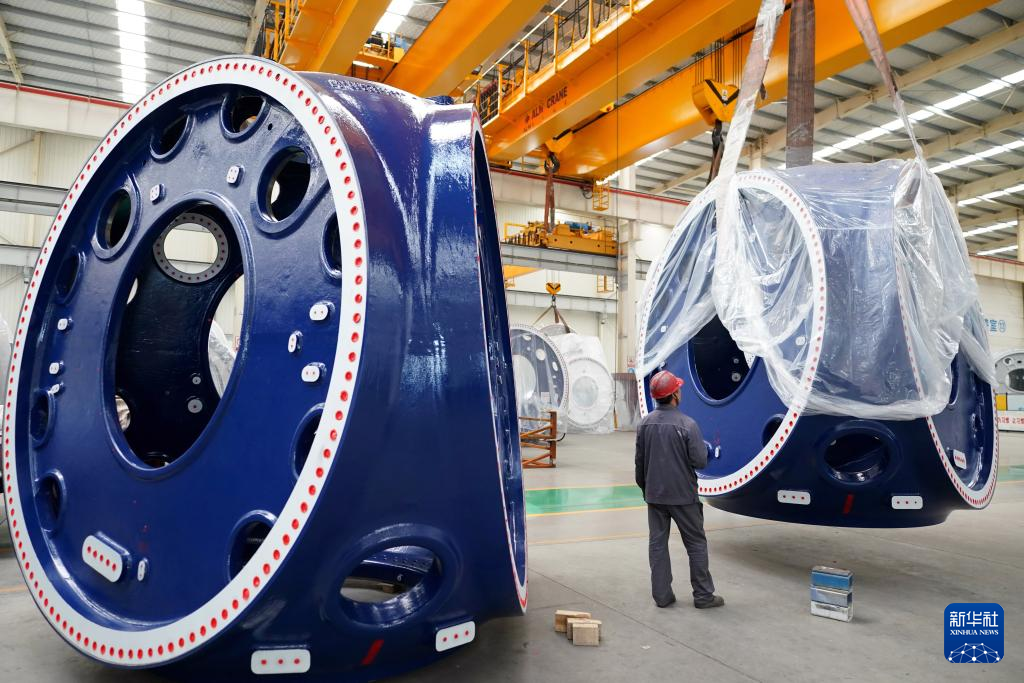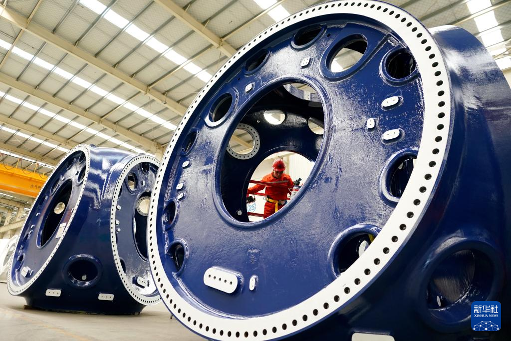 山东省滨州市惠民县是我国重要的风电装备制造基地之一,该县依托山东省风电产业链“链主”企业之一的山东国创精密机械有限公司,成立风电装备制造产业园,可生产轮毂、定轴、转轴、叶片等20余种风电铸造产品。目前,风电装备产业已成为助推当地经济高质量发展的重要引擎。新华社记者 杨世尧 摄