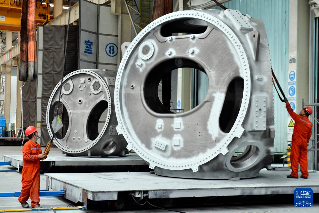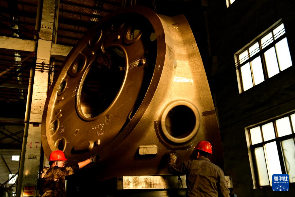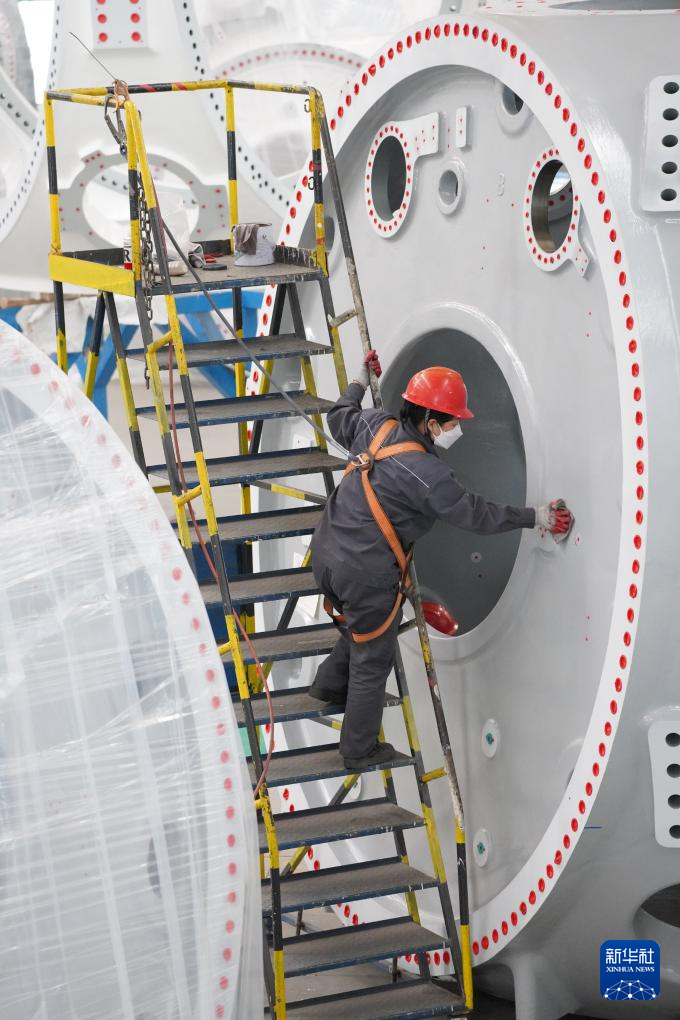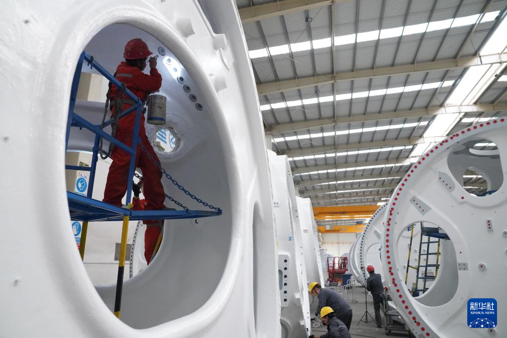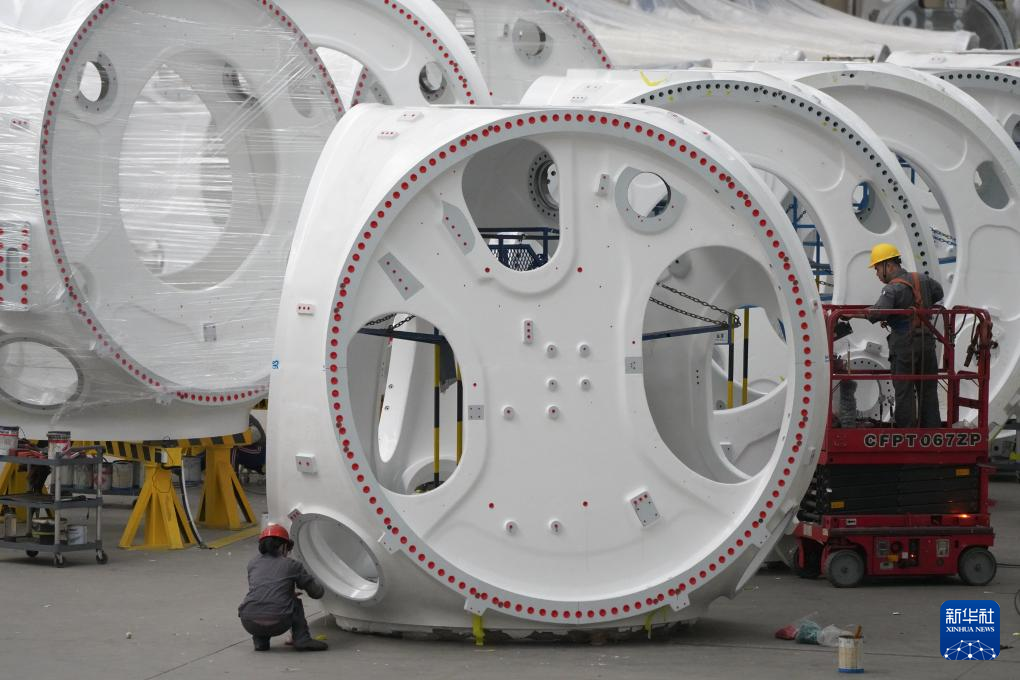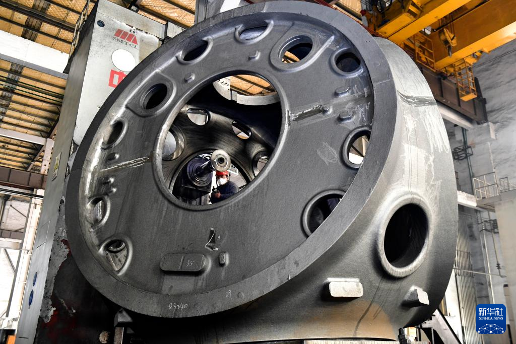 山东省滨州市惠民县是我国重要的风电装备制造基地之一,该县依托山东省风电产业链“链主”企业之一的山东国创精密机械有限公司,成立风电装备制造产业园,可生产轮毂、定轴、转轴、叶片等20余种风电铸造产品。目前,风电装备产业已成为助推当地经济高质量发展的重要引擎。新华社记者 杨世尧 摄