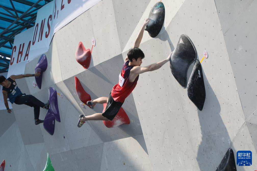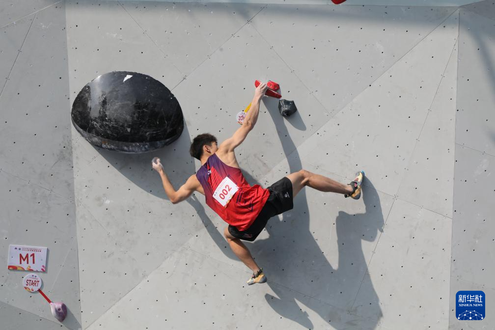 10月10日,中国选手胡隽喆在男子攀石预赛中。