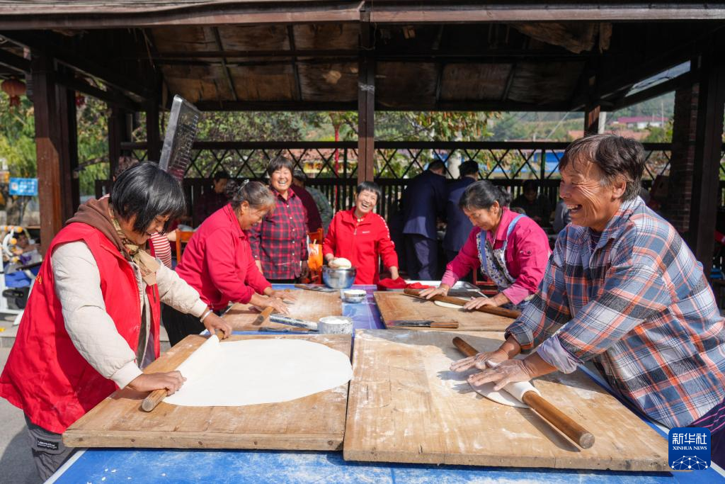 10月10日,志愿者在博山区池上镇池埠村长者食堂和老人一起包饺子。新华社记者 朱峥 摄