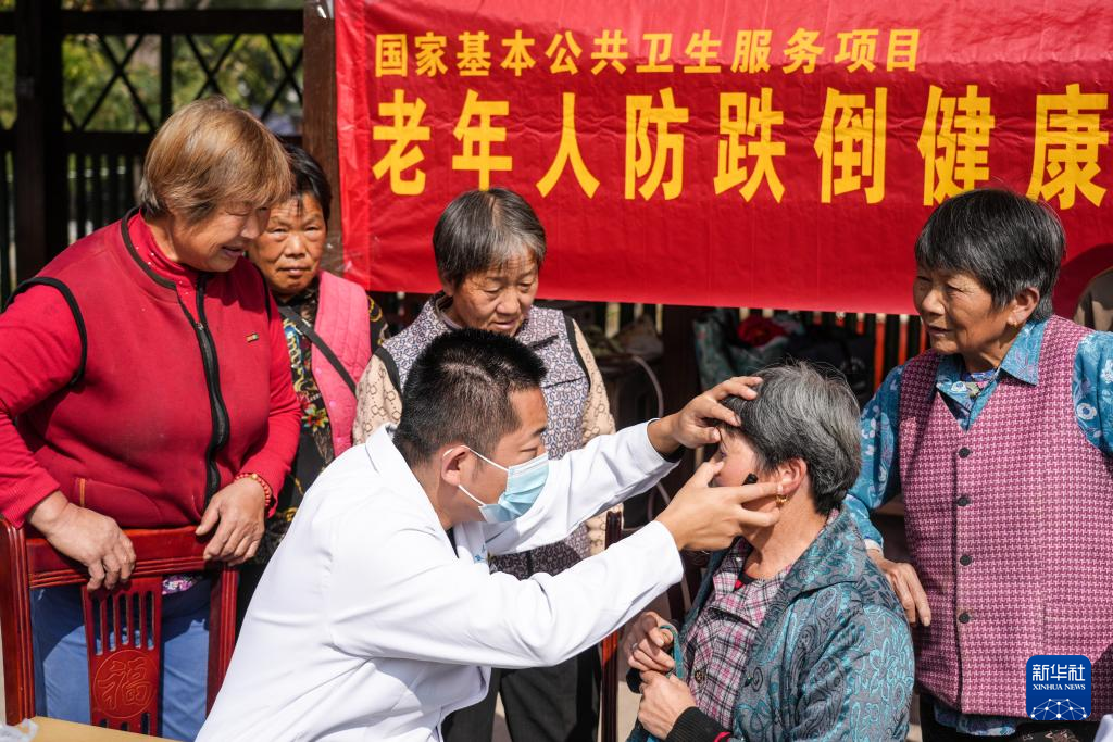 10月10日,博山区池上中心卫生院医生在池埠村长者食堂为老人义诊。新华社记者 朱峥 摄