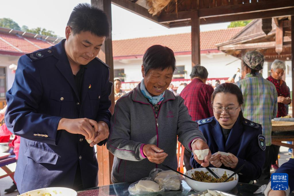 10月10日,博山区公交公司志愿者在池上镇池埠村长者食堂和老人一起包饺子。新华社记者 朱峥 摄