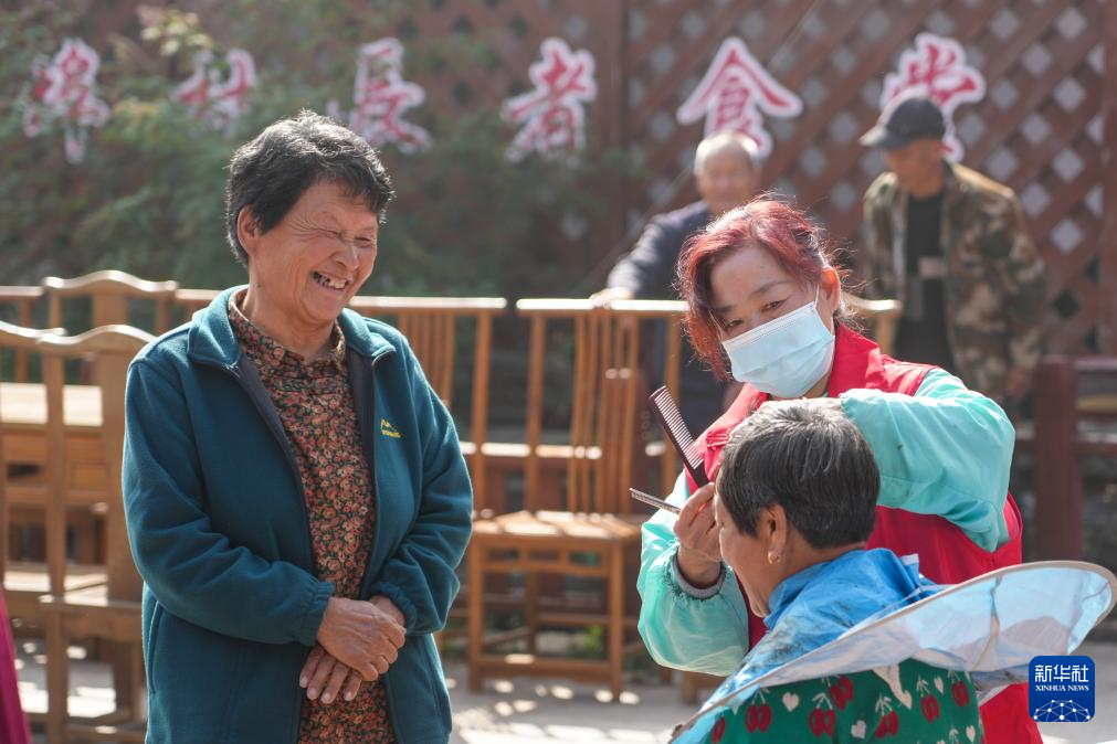 10月10日,志愿者在博山区池上镇池埠村长者食堂为老人免费理发。新华社记者 朱峥 摄