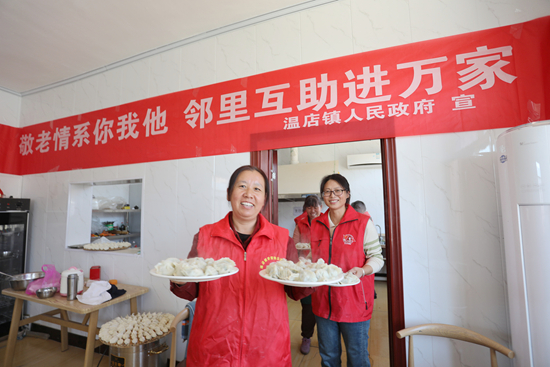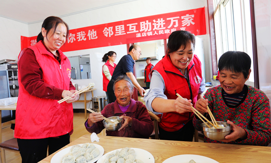 10月10日,在山东省滨州市阳信县温店镇赵马虎村的孝善食堂里,数十名70岁以上的老人开心地品尝免费可口的水饺,感激之情溢于言表。