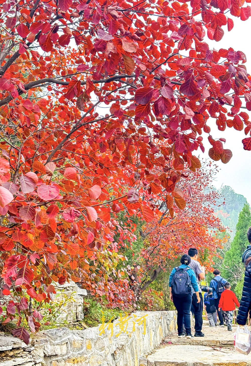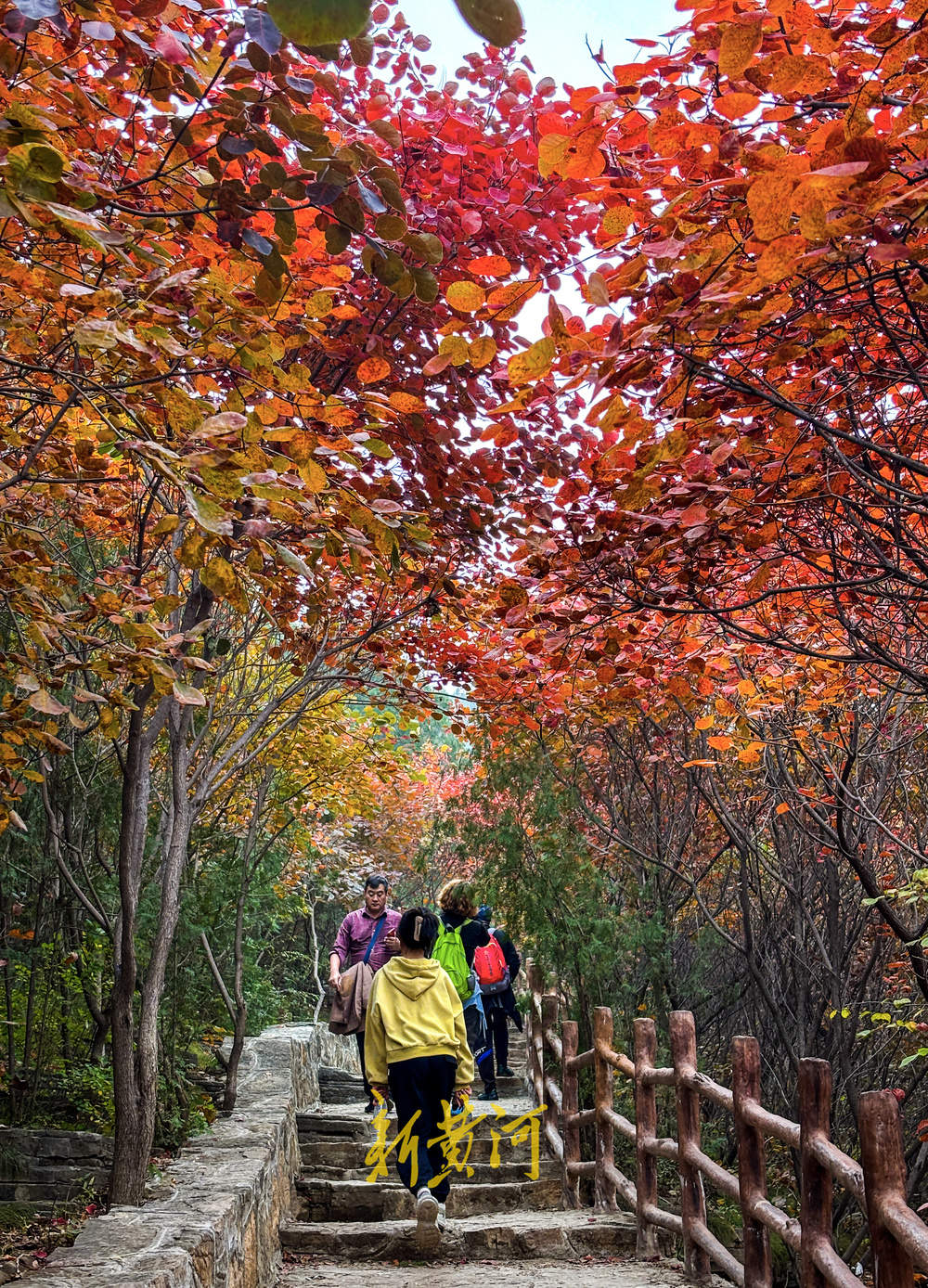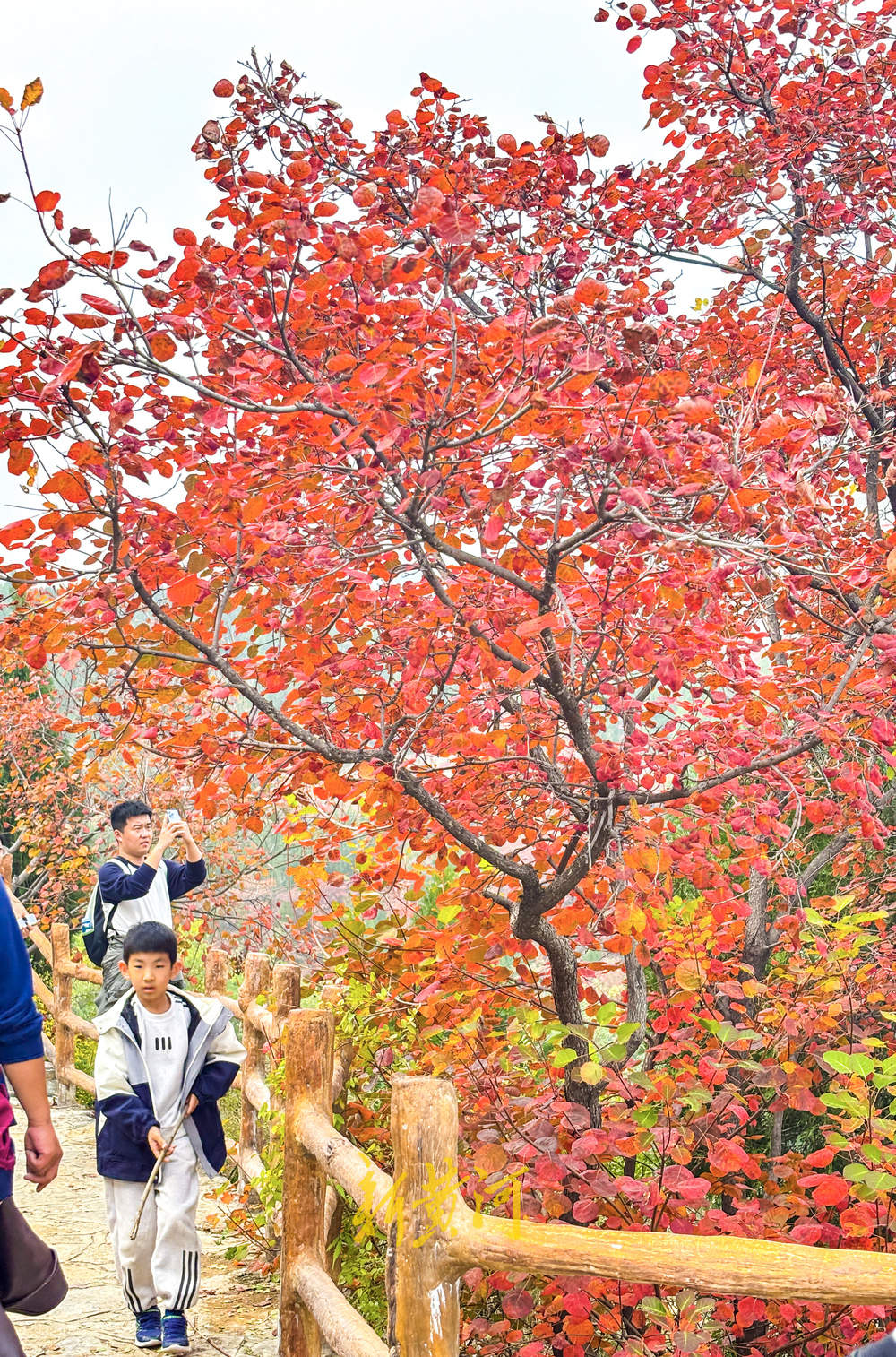 红叶主打树种黄栌如今美不胜收,黄色、橙色、红色、深红色,色彩丰富。