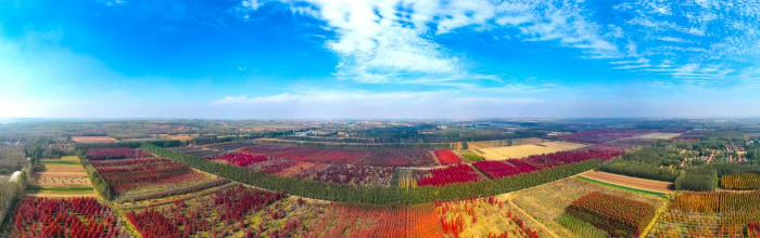 10月26日,五莲县汪湖镇,航拍下的千亩枫林层林尽染,红、黄、绿的色彩交织在一起,宛如大自然的调色板。叶连俊 摄