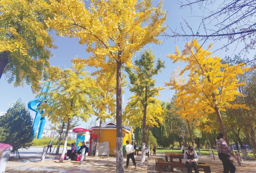 济南市民在泉城广场的银杏林游玩。近日,泉城广场泉标西侧的两片银杏林逐渐变成金黄色,金灿灿的树叶在阳光的照耀下散发出迷人的色彩,吸引了不少市民前来欣赏。(记者 崔健 摄)