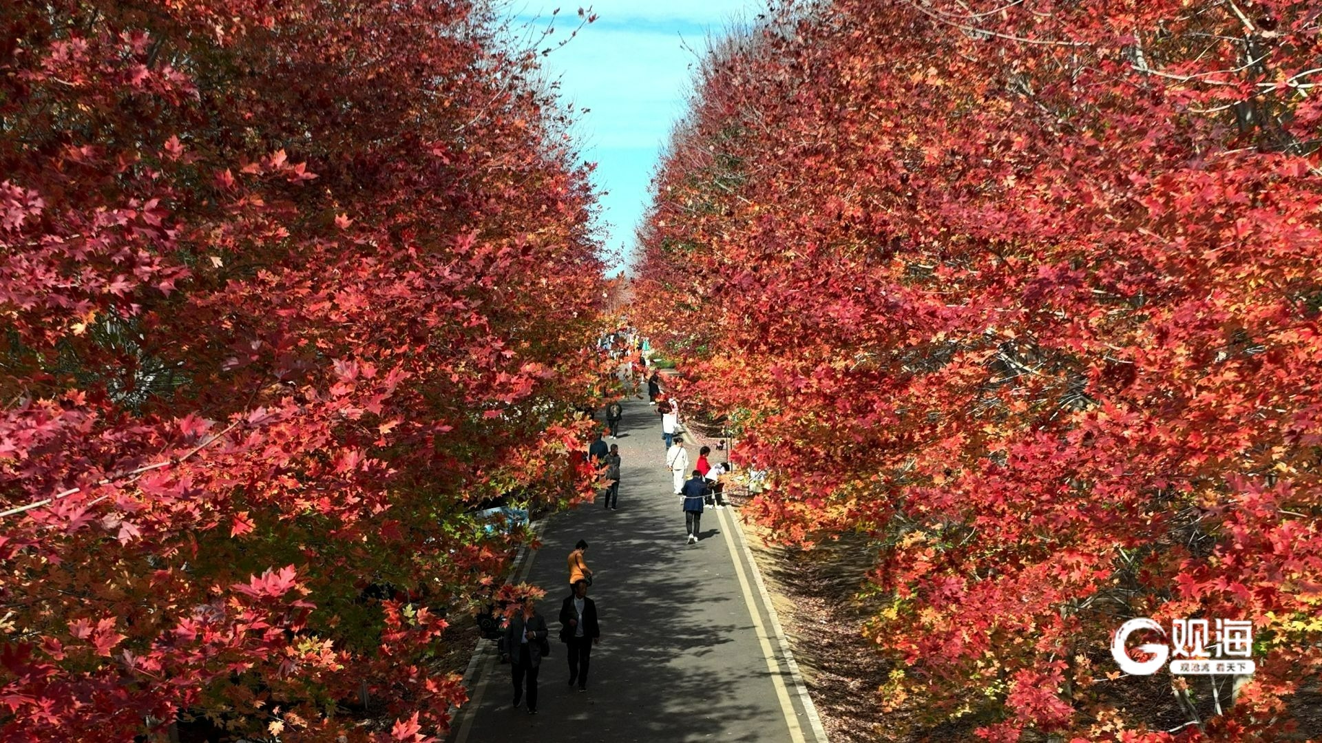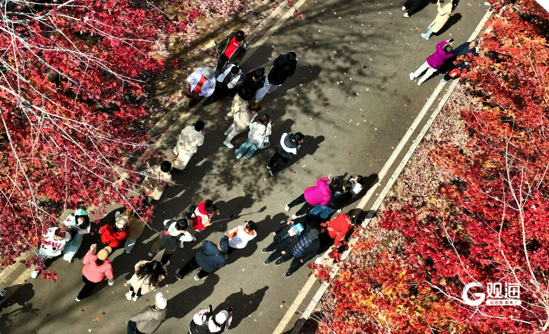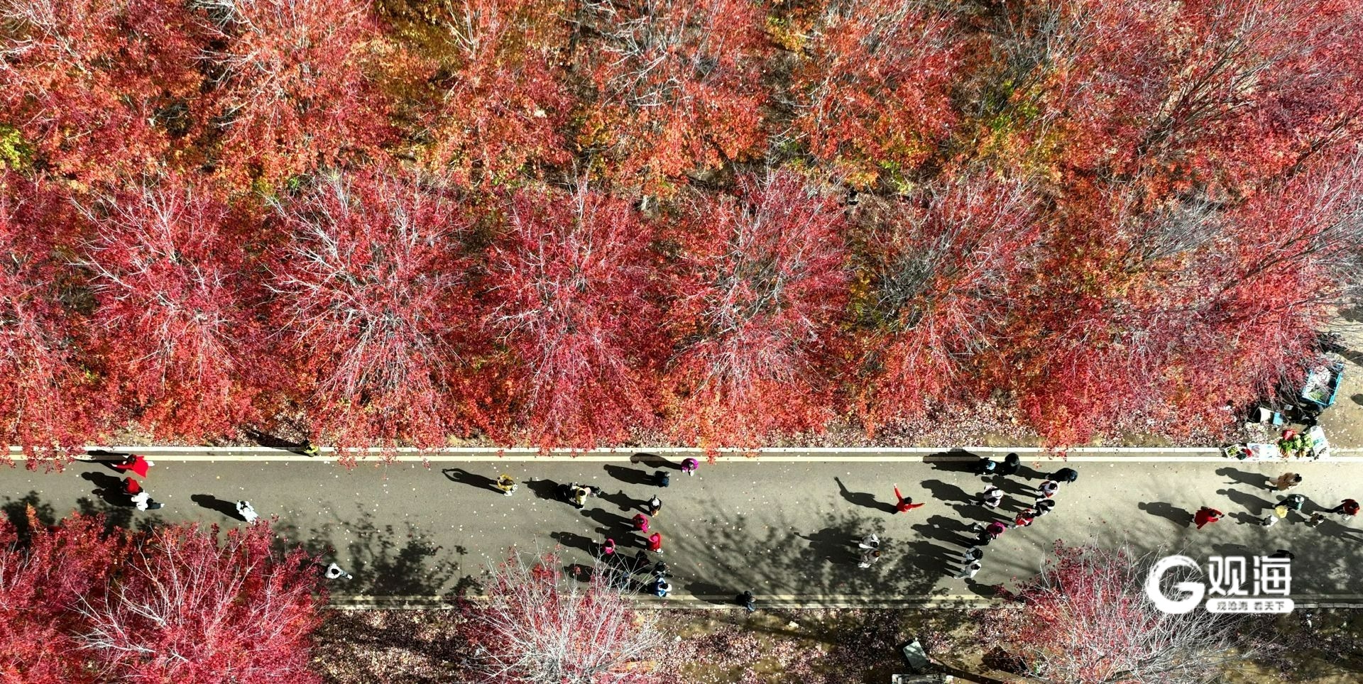 “停车坐爱枫林晚,霜叶红于二月花。”青岛西海岸张家楼迎来一年一度的最美红叶季,4日中午,千亩枫叶林里人流如织,众多市民游客前来拍照打卡,沉醉在这片“枫”景中。