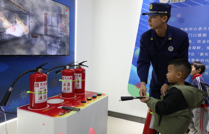 11月9日是“全国消防日”。在山东省滨州市阳信县劳店镇湖畔嘉苑社区科普馆,社区的孩子和老人们在消防救援队员的指导下进行模拟灭火训练和报警电话常识模拟,旨在让居民都能掌握基本的消防安全知识和技能,共同营造安全和谐的居住环境。