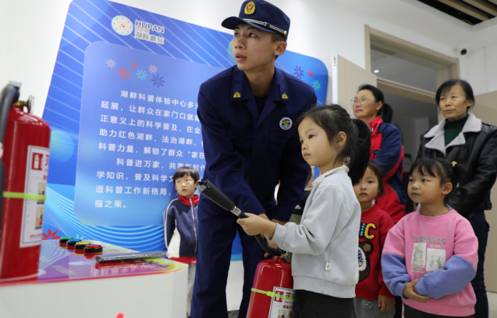 消防救援队员为社区的孩子和老人们讲解灭火器的使用方法。