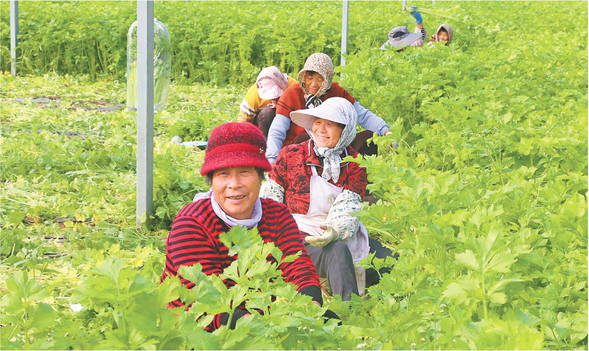 近日,在山东省日照市东港区涛雒镇东石梁头村现代蔬菜农业产业园内,村民正在采摘芹菜。