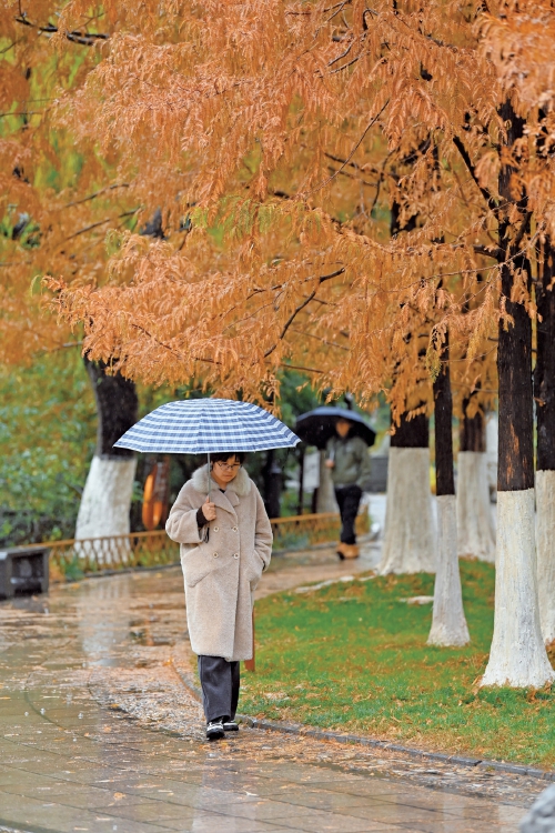 25日,游客漫步在雨中的五龙潭公园。济南时报·新黄河客户端记者王汗冰 摄