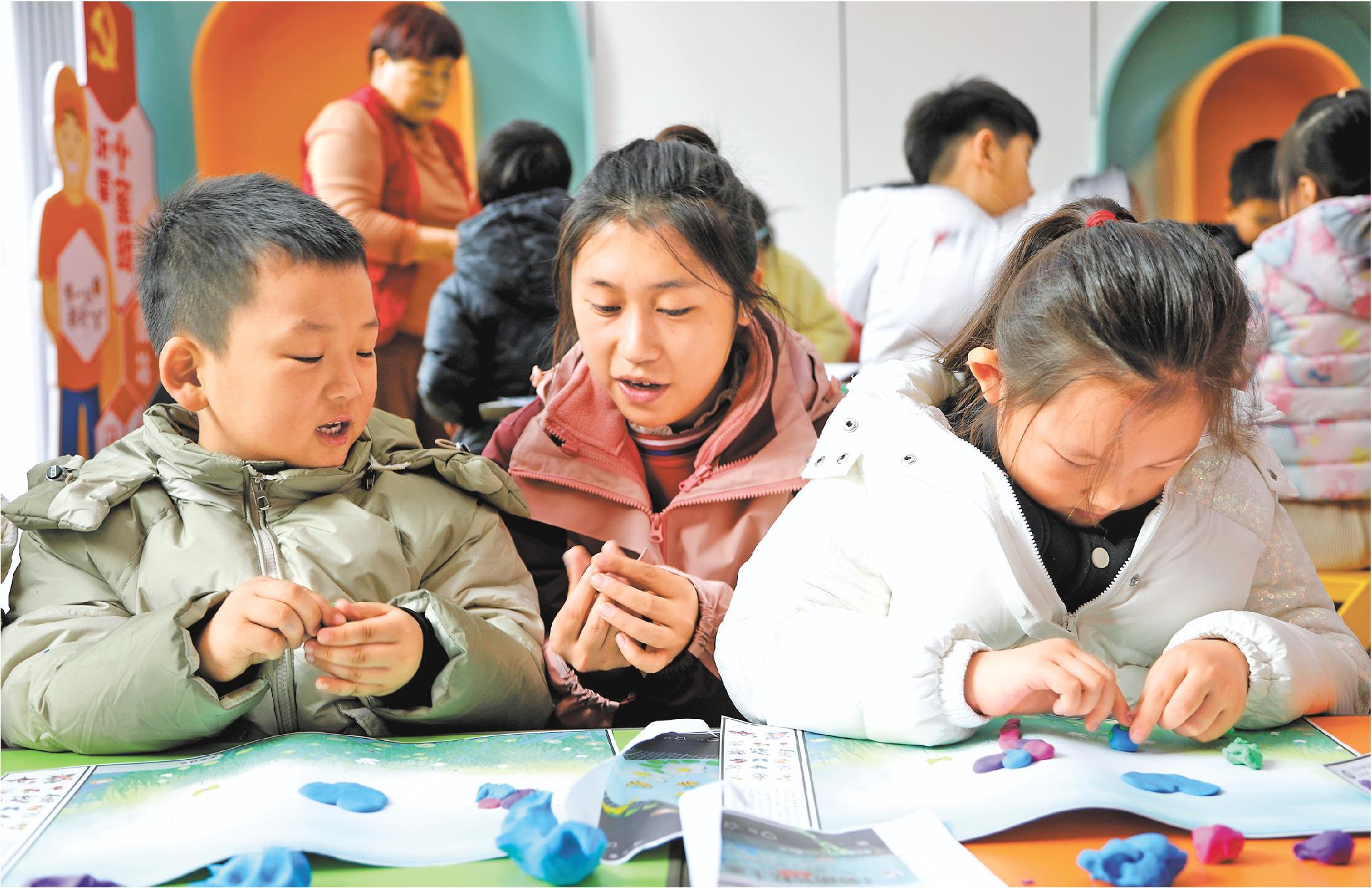 12月4日,在山东省临沂市兰山区荣昌社区,一名志愿者带着社区小朋友做手工。