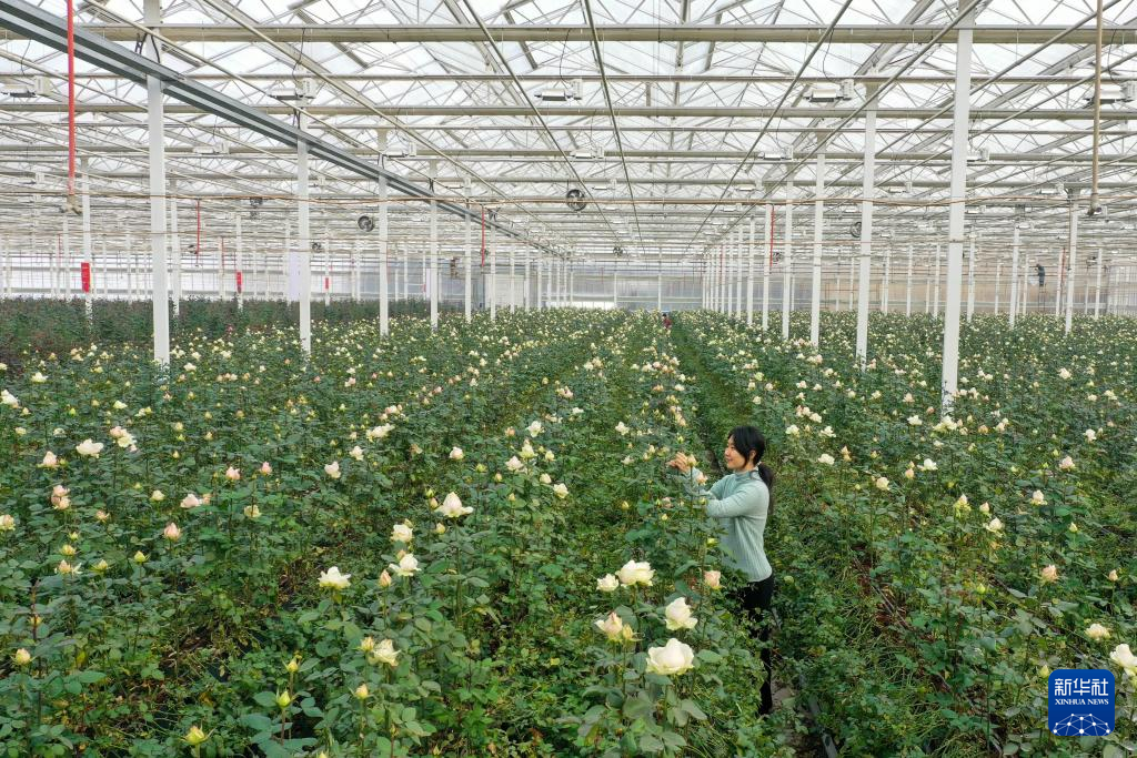12月10日,工作人员在温室内采摘玫瑰(无人机照片)。新华社记者 朱峥 摄