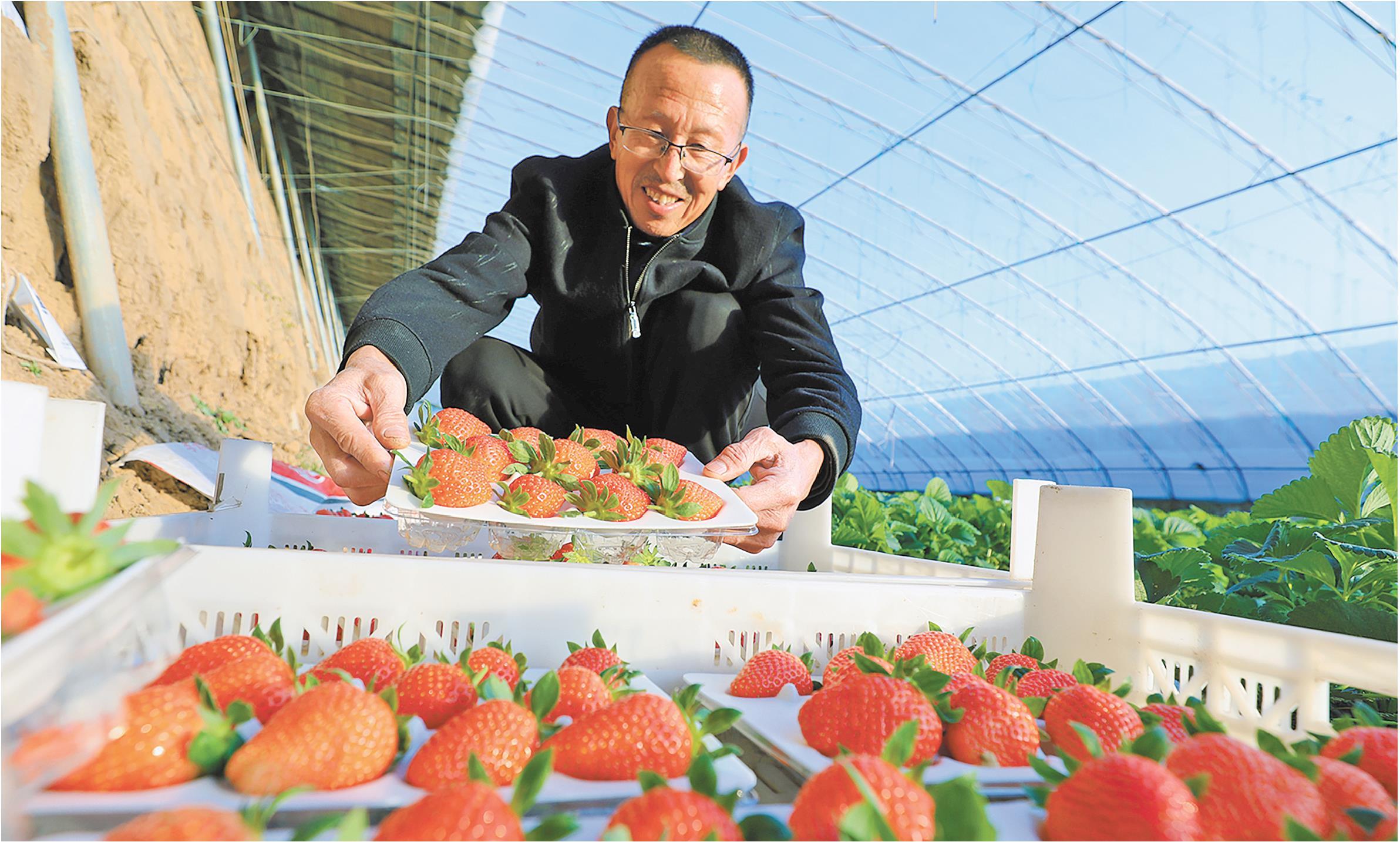 眼下,在山东省无棣县海丰街道徐庙村为农人(海丰)生鲜种植采摘基地的大棚内,圣女果丰收满架,草莓红艳飘香。该基地占地180余亩,目前8个草莓种植大棚和8个西红柿种植大棚均成熟上市,吸引当地游客和周边县市游客前来体验采摘乐趣(上图)。