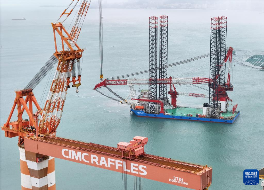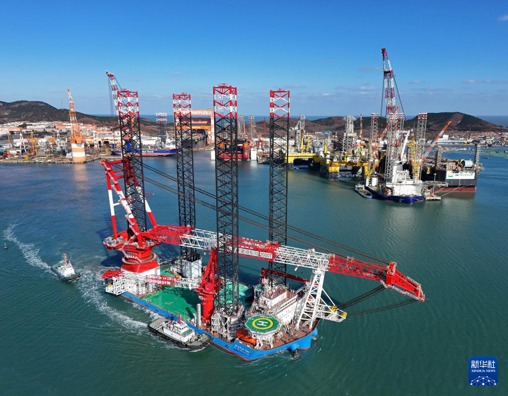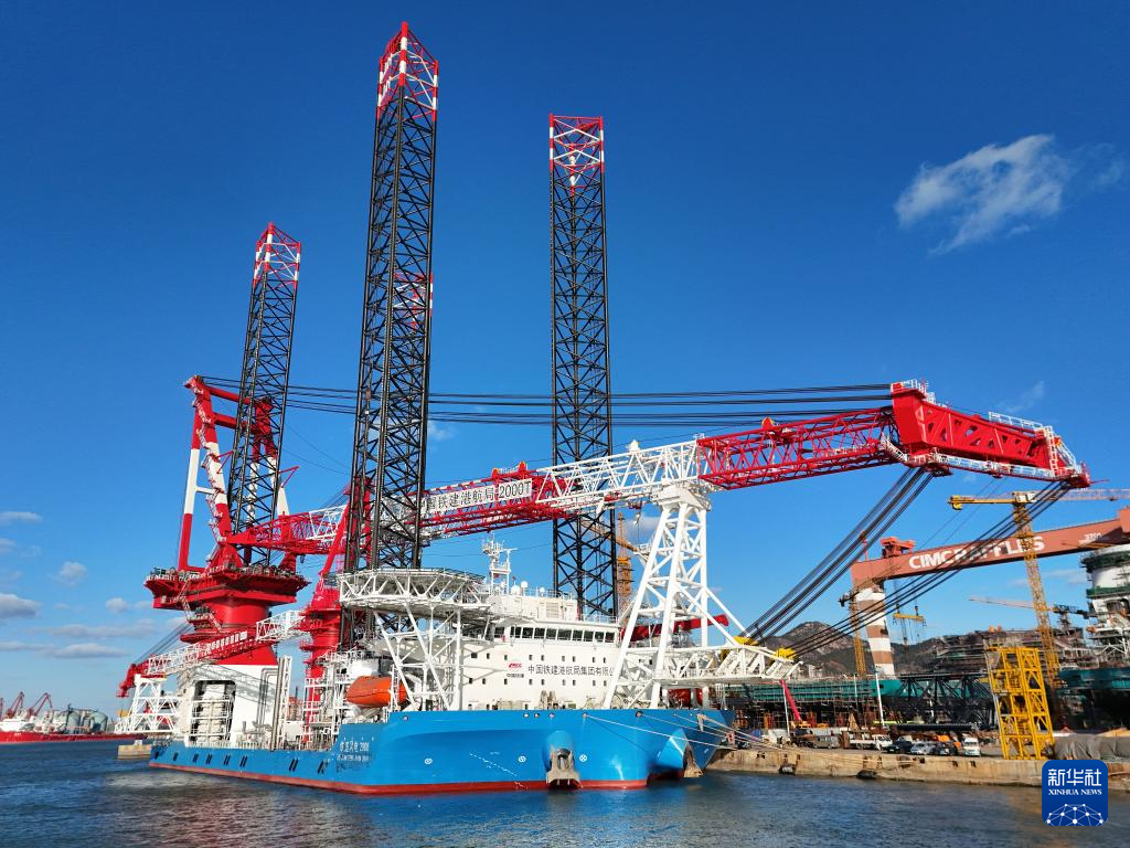 12月28日,第四代自升自航式风电安装船“铁建风电2000”在中集来福士山东烟台建造基地交付。该船装备了起吊能力达2000吨的全回转起重机,可在水深80米的海域进行20兆瓦以上各型海上风机的安装施工。新华社发(唐克 摄)