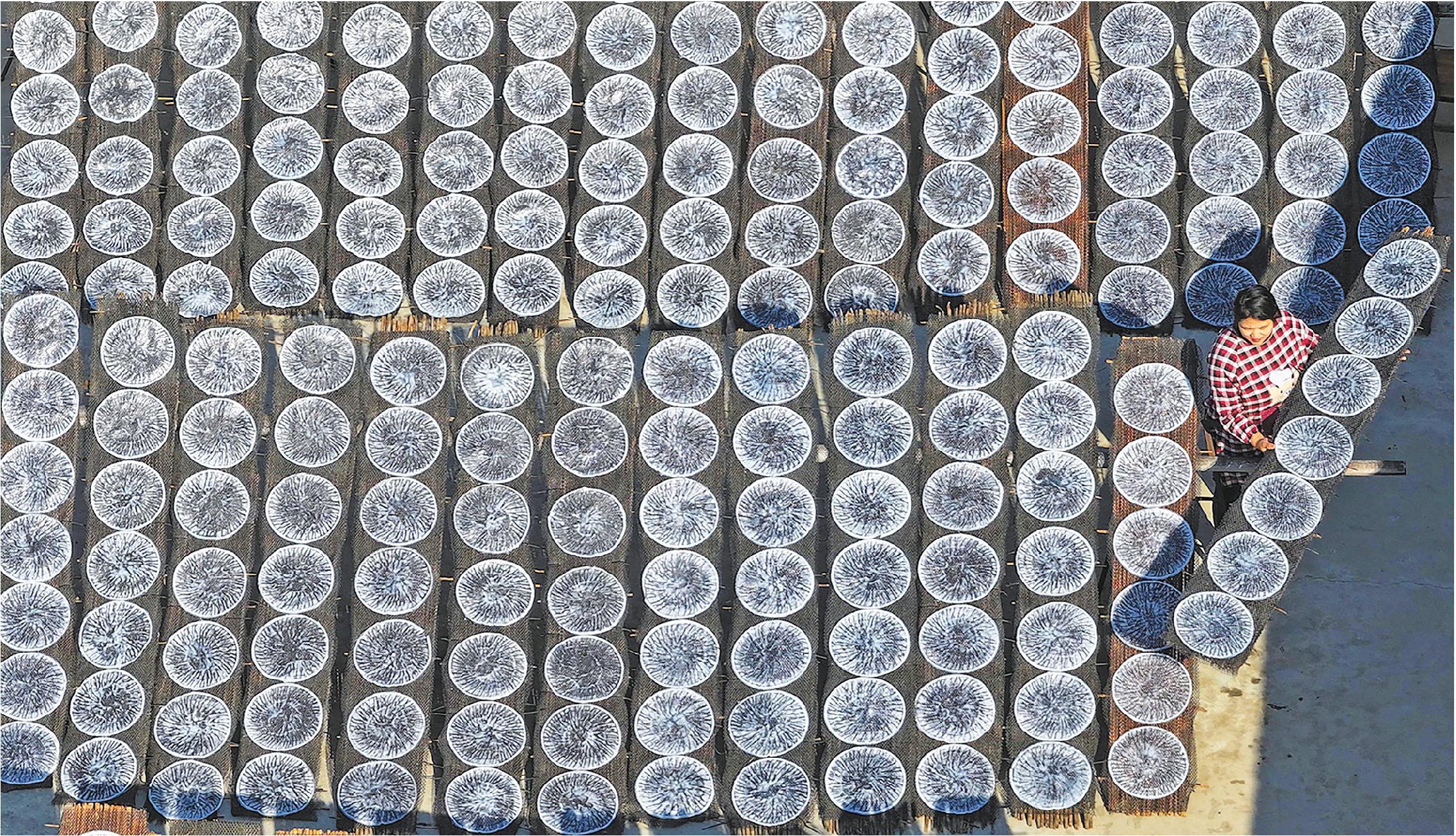 年关将近,在山东省聊城市东昌府区斗虎屯镇张满村,村民吴艳香正忙着晾晒手工制作的绿豆粉皮(上图)。