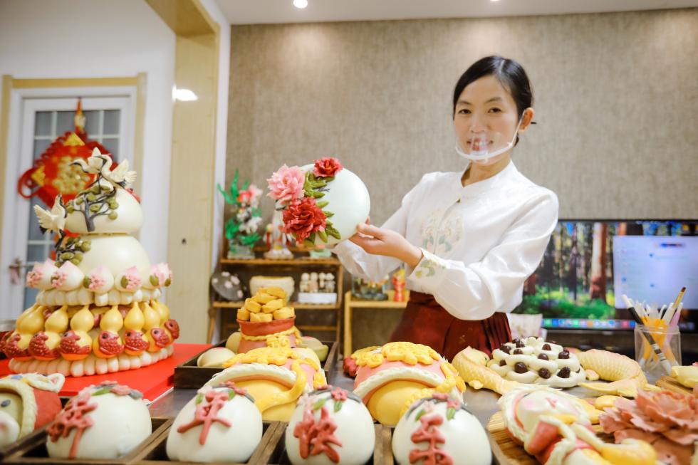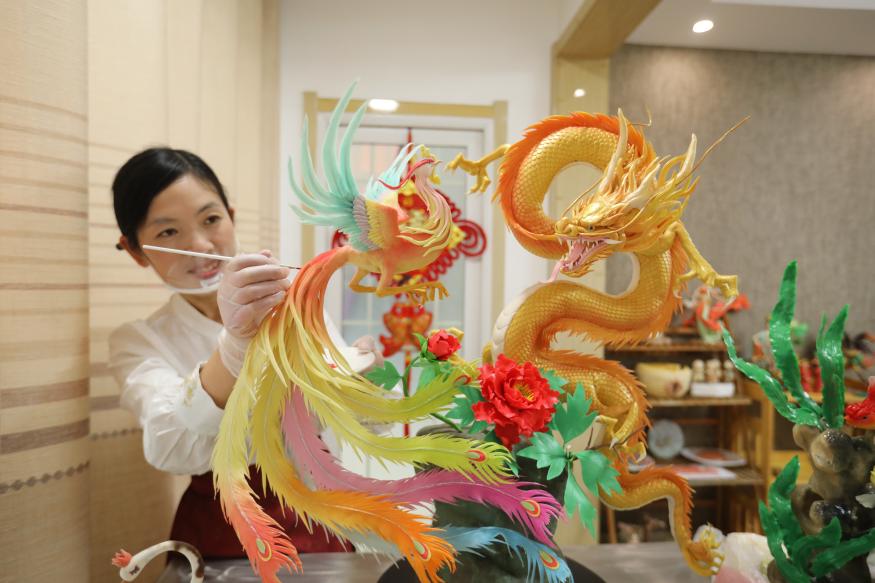 龙凤呈祥造型的花馍栩栩如生。新华网发(宋年升 摄)