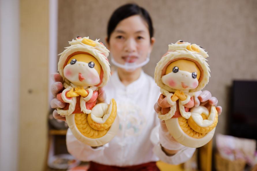 “蛇宝宝”花馍灵动而俏皮。新华网发(宋年升 摄)