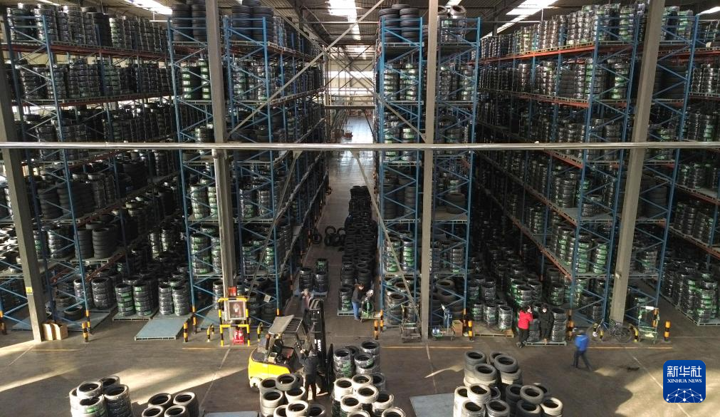 2月7日,在位于山东省广饶县的山东宏盛橡胶科技有限公司轮胎产品仓库,工作人员在搬运轮胎产品(无人机照片)。